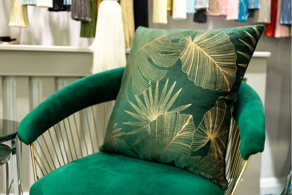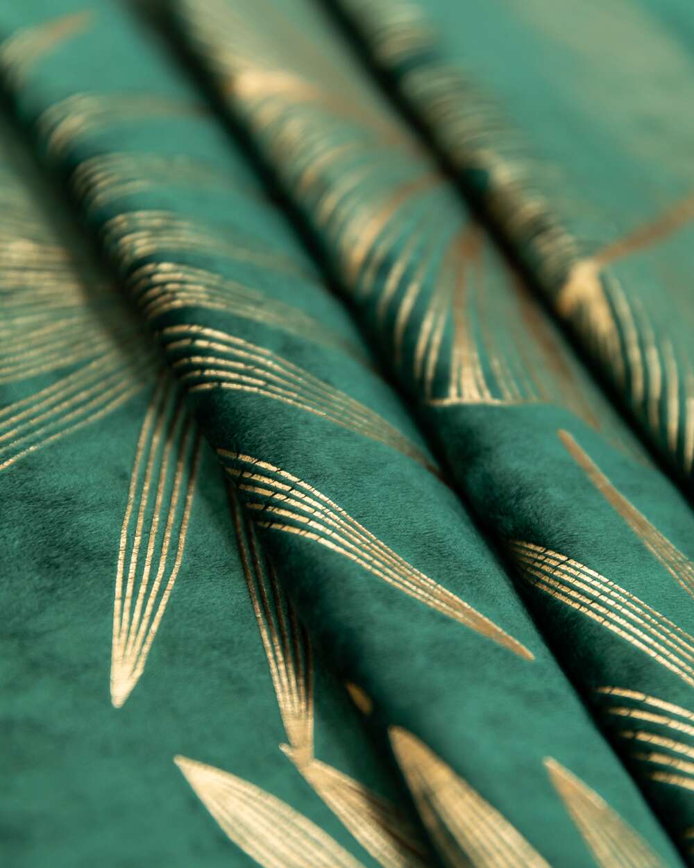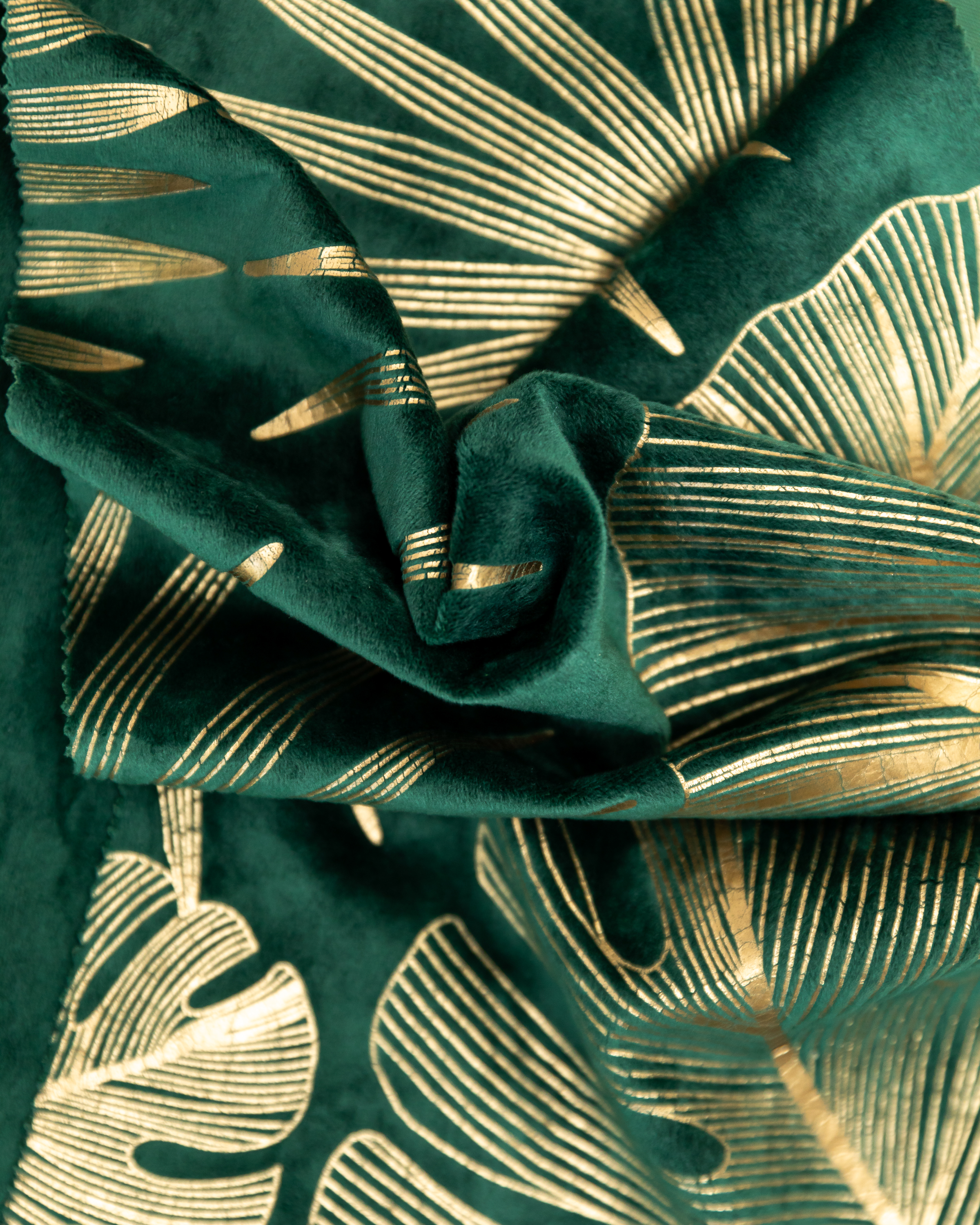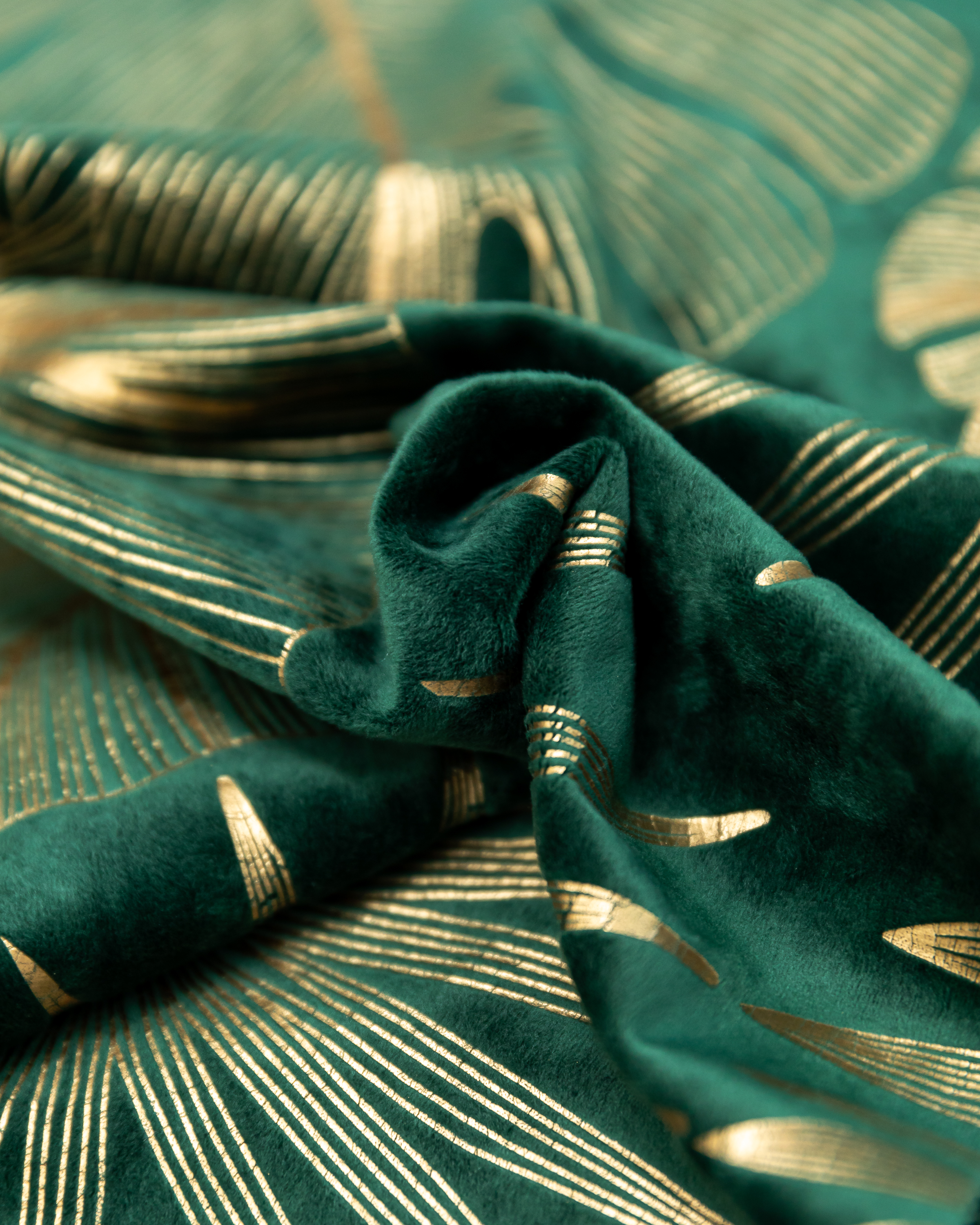 Tesatura draperie Mississippi crushed velvet cu frunze aurii, verde