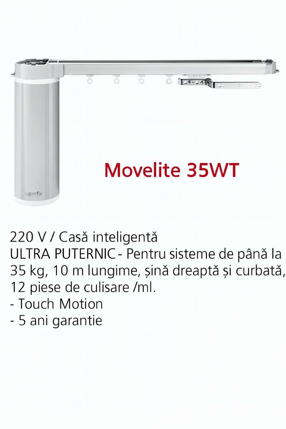 Movelite 35WT este un motor Somfy de ultimă generație, proiectat pentru sisteme de perdele rezidențiale sau comerciale care necesită o soluție fiabilă, silențioasă și puternică. Funcționează la 220 V și suportă perdele cu o greutate de până la 35 kg, oferind o acționare lină și elegantă pe șine drepte sau curbate, cu lungimi de până la 10 metri.