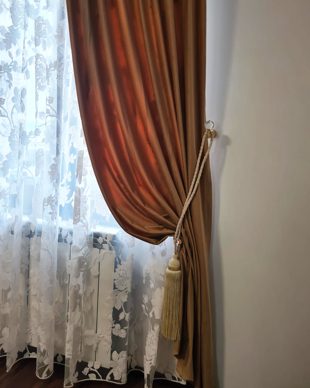 La solicitarea clientului draperia poate fi îmbogățită cu pasmanterie, oferind decorului un plus de frumusețe.