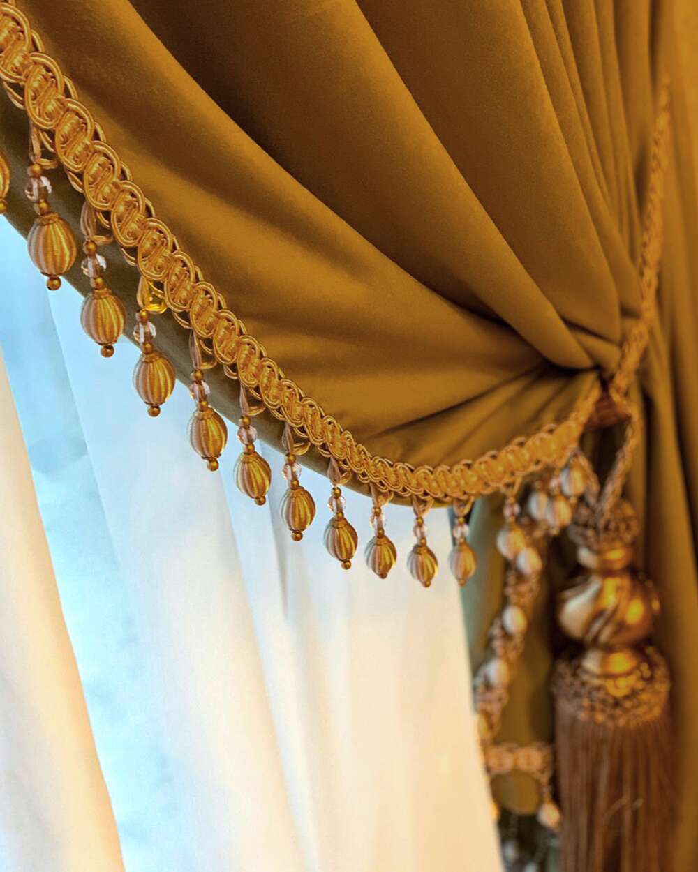 Tesatura draperie Bruxelles, de culoare mustar, este perfecta pentru a infrumuseta orice incapere.  Materialul fin de catifea aduce un plus de rafinament si eleganta caminului tau si ofera decorului o nota aparte. La solicitarea clientului draperia poate fi îmbogățită cu pasmanterie, oferind decorului un plus de frumusețe.