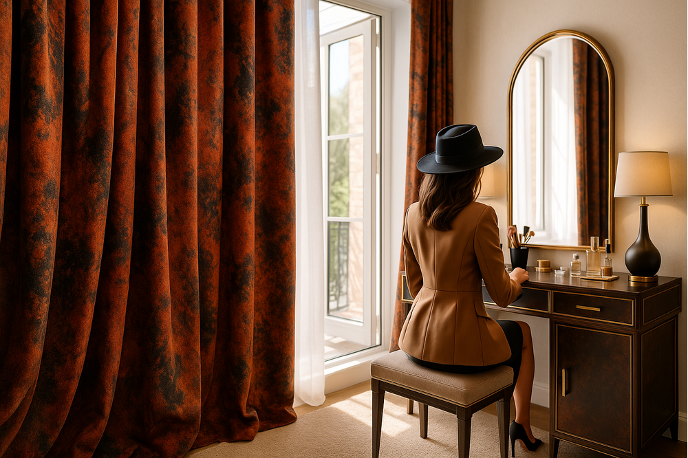 Modelul abstract, cu accente de auriu și umbre întunecate, evocă o estetică contemporană cu note clasice, perfectă pentru interioare cu personalitate. Draperia se integrează armonios în decoruri sofisticate — de la livinguri ample la spații hoteliere sau birouri elegante.