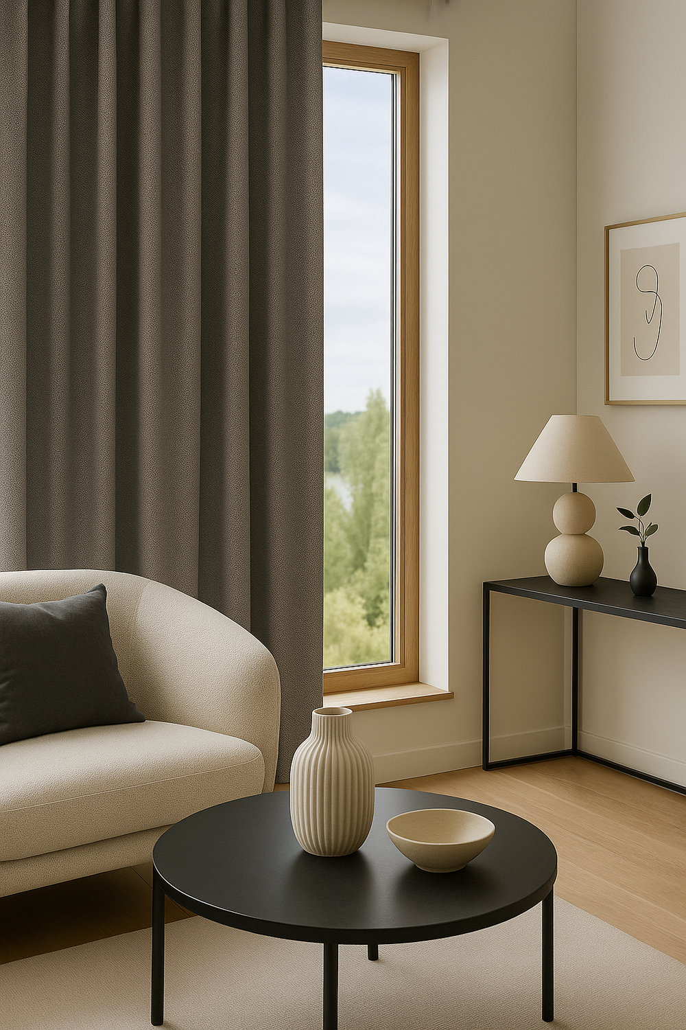 Datorită versatilității sale cromatice, această draperie completează armonios livingurile, dormitoarele sau spațiile hoteliere, fiind ideală alături de perdele din voal ivoire, alb fildeș sau crem deschis, pentru un efect luminos și echilibrat.