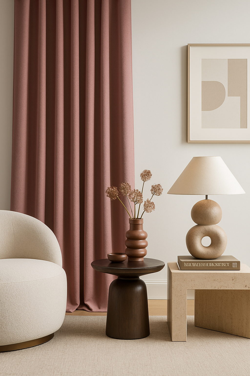 • Această draperie se armonizează frumos cu perdele din voal bej rozé, gri perlat sau grej deschis, care echilibrează tonul cald al materialului și aduc luminozitate naturală în decor.