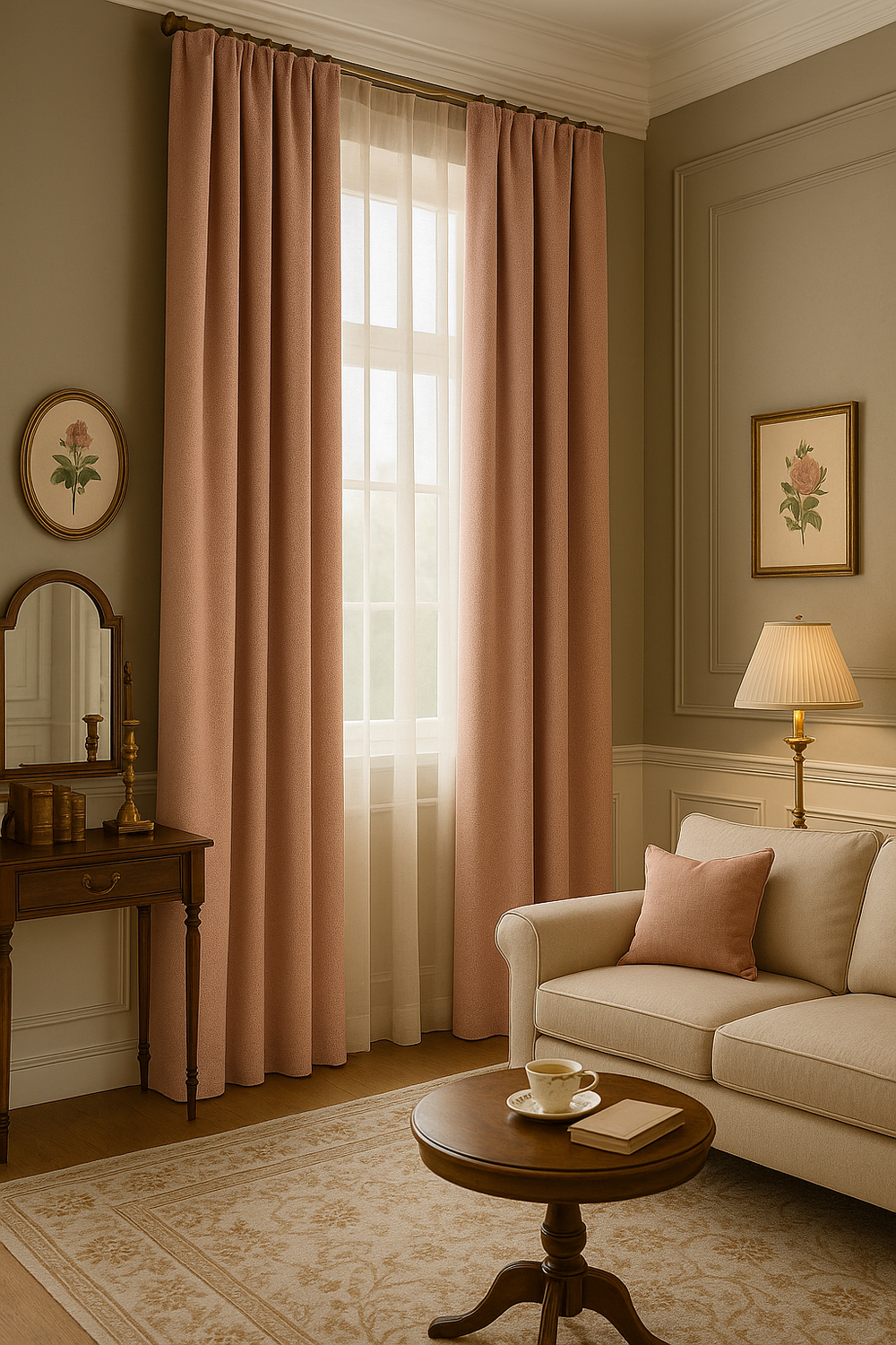 Această draperie se integrează cu ușurință în amenajări moderne, contemporane sau în stil romantic, fiind potrivită pentru livinguri, dormitoare sau camere de hotel. Pentru un decor echilibrat, se poate asocia cu perdele din voal alb fildeș sau bej deschis.