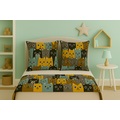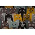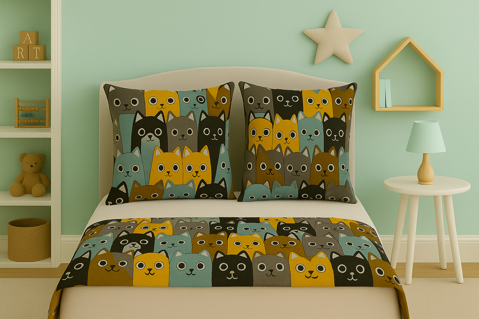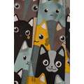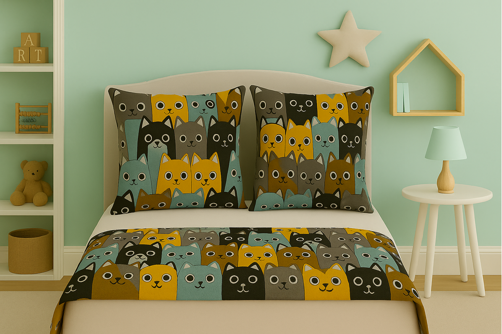 Model cu pisici stilizate în tonuri calde de galben, albastru și gri, ideal pentru camere de copii (fete și băieți)